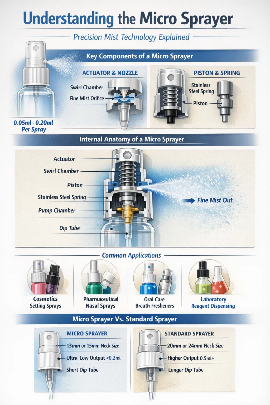 Ad respondendum quaestio "Quid est Micro sprayer?" , praecise machinalis dispensatio est ut liquorem in perquam subtiliter convertat, caligo cohaerens cum infimo volumine per ictu. Secus vexillum trigger sprayers usus est in familia purgatio, a Micro sprayer typically dispensat inter 0.05ml et 0.20ml producti ad tempus, cum optimam electionem pro liquoribus magni pretii, ubi dosis moderatio et applicatio delicata precipua sunt.